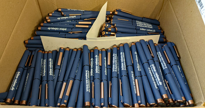 Wir haben übrigens wieder neue Werbe-Kugelschreiber bekommen. Eigentlich hatten wir noch genügend alte Kulis, die fast genauso aussehen, aber das neue Design ist irgendwie moderner, knackiger.
