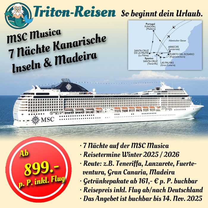 Der aktuelle Catch of the Week von MSC Cruises führt euch im kommenden Winter in die Sonne: 7 Nächte auf der MSC Musica ab Santa Cruz de Tenerife, zu sehen bekommt ihr neben Teneriffa auch Lanzarote, Gran Canaria, Fuerteventura, La Palma und natürlich Funchal auf Madeira. (Je nach Reisedatum sind die Routen unterschiedlich zusammengestellt)