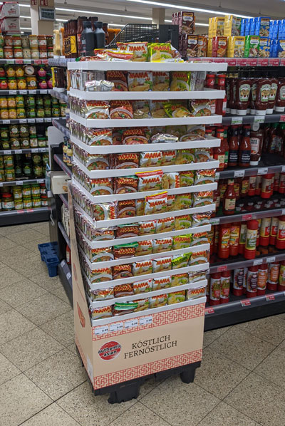 Hier zum Beispiel standen unterschiedliche Produkte aufstellerweise parallel im Markt, aus den Nissin Cup Noodles haben wir den