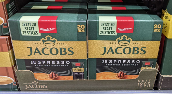 Hinweis auf den Espresso-Tassenportionen von Jacobs: Statt 25 sind nun nur noch 20 Sticks in einer Schachtel. Überall wird ja heimlich verkleinert und getäuscht, da wollte man hier wohl mal ganz klar ein Zeichen in die andere Richtung setzen. Find ich gut.