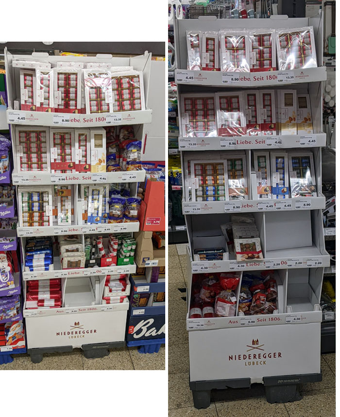 Mit den Weihnachtssüßwaren in der vergangenen Saison hatten wir auch einen gemischten Aufsteller mit Produkten von Niederegger bekommen, also vor allem Marzipan in den unterschiedlichsten Variationen. Diese Artikel waren nicht speziell weihnachtlich, so dass wir sie nicht nach dem Weihnachtsfest zum Sonderpreis rausgehauen haben – und so steht dieses Display bis heute hier im Laden.