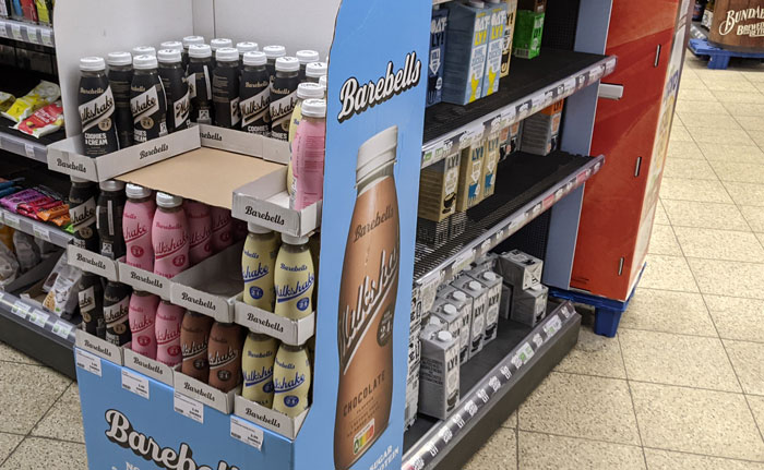 Da die Riegel so gut laufen, hatte ich mich im Spätsommer letzten Jahres mal in der Vorbestellung an ein Display Milchshakes von Barebells herangetraut. Aber da war ich wohl etwas zu optimistisch. Der Aufsteller steht nun seit Mitte Oktober 2025 hier im Laden und die Abverkäufe halten sich in erstaunlich übersichtlichen Grenzen. Ich gebe zu, dass mich das wirklich überrascht hat.