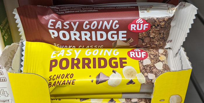 Seit ein paar Tagen haben wir Porridge auch als Riegel in zwei unterschiedlichen Sorten im Angebot. Bestellt hatte diese Produkte meiner Meinung nach niemand mutwillig, also haben wir sie mutmaßlich durch eine zentralseitige Zuteilung bekommen.