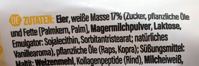 Bleibt die Frage ob "Weiße Masse" eine offizielle Bezeichnung im Lebensmittelrecht ist, die so da in der Zutatenliste stehen darf (darf ganz offenbar) oder ob solche eigenen Bezeichnungen erlaubt sind, wenn die korrekte Aufschlüsselung dahinter zu finden ist. Weiß da jemand mehr?