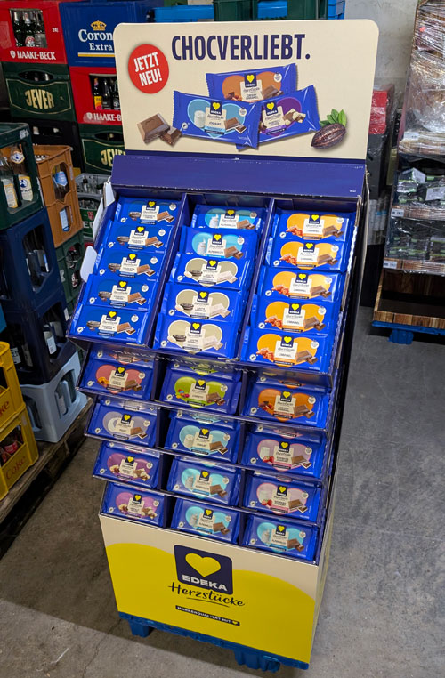 Einen Teil der neuen Eigenmarken-Schokoladen der Edeka haben wir bereits seit ein paar Wochen im Sortiment, nun haben wir vor ein paar Tagen gleich ein komplettes Display mit den unterschiedlichen Sorten bekommen.