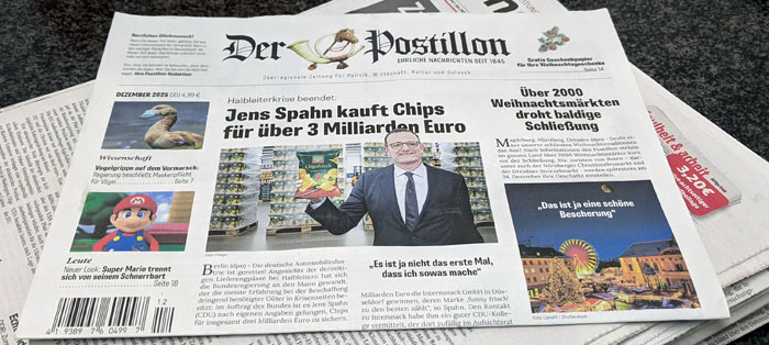 Fundstück in den zur Abholung bereitgelegten Zeitungen (aka "Remis"): Der Postillon in der auf Papier gedruckten Ausgabe. Falls sich jemand über meine Verwunderung wundert: Ich weiß, dass das lang und schlapp angekündigt worden ist. Und ich gebe zu, dass ich diese Ankündigungen ihrerseits für Spaßnachrichten gehalten habe. Rechnet man doch nicht mit, dass im Postillon mal die Wahrheit steht.
