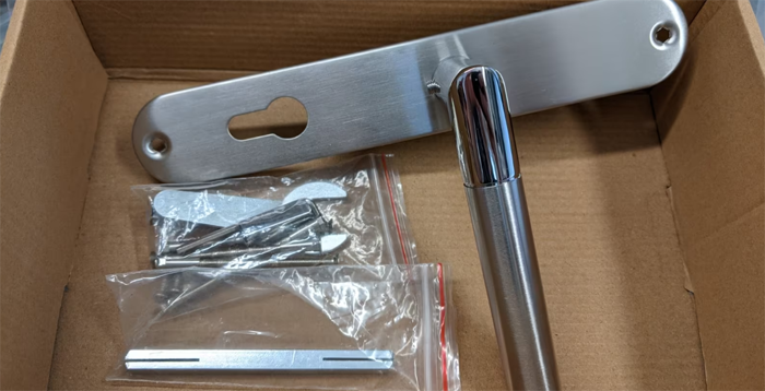 In dem Karton mit der neuen Drückergarnitur mit Knauf lagen, damit sie von beiden Seiten montiert werden kann, neben dem Schild mit Knauf auch zwei Drücker – einer für jede Seite. Ist nicht ganz sinnlos, da der Hersteller ja nie weiß, wie die Tür angeschlagen ist. (Alternativ könnte man zwei Sets produzieren …)
