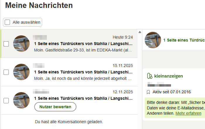 Wie auch immer: Wir hatten eines dieser Langschilde mit Drücker übrig und ich wollte es auch nicht einlagern. Ich brachte es aber auch irgendwie nicht übers Herz, dieses nagelneue und komplett unbenutzte Teil einfach ins Altmetall zu werfen und so machte ich mir die Mühe, das Ding in der zu-verschenken-Rubrik auf kleinenzeigen.de anzubieten.