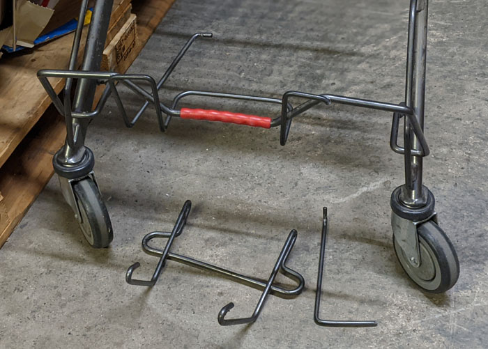Ich würde gerne den Rest von der nun komplett nutzlos gewordenen Kistenablage auch noch demontieren, dass ist es eben nur noch ein einfacher Einkaufswagen, aber dazu müsste ich mal daran denken, meinen Winkelschleifer von zu Hause mit zur Firma zu schleppen. Anders lassen sich die beiden Bolzen nämlich offenbar nicht lösen. Wenn es so weit ist, werde ich berichten. :-P