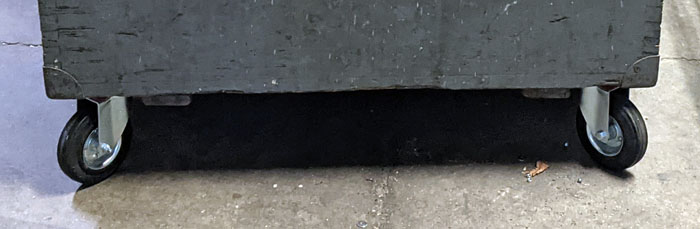 Die Idee mit der Verstärkung des Bodens durch eine dicke Holzplatte hatten wir verworfen. Die Verbindung zwischen den Rädern und der Kiste war ja auch in der Vergangenheit nie das Problem, die Räder selber waren auseinandergefallen. Die Schrauben halten problemlos, da wir die Räder etwas anders platziert anbringen konnten. Die alten (kleineren) Rollen benötigten immer einen gewissen Abstand zu den beiden quer montierten Brettern, da sie sich daran sonst festgeklemmt haben. Die neuen Räder sind groß genug, so dass sie nicht mit dem Holz in Kontakt kommen.