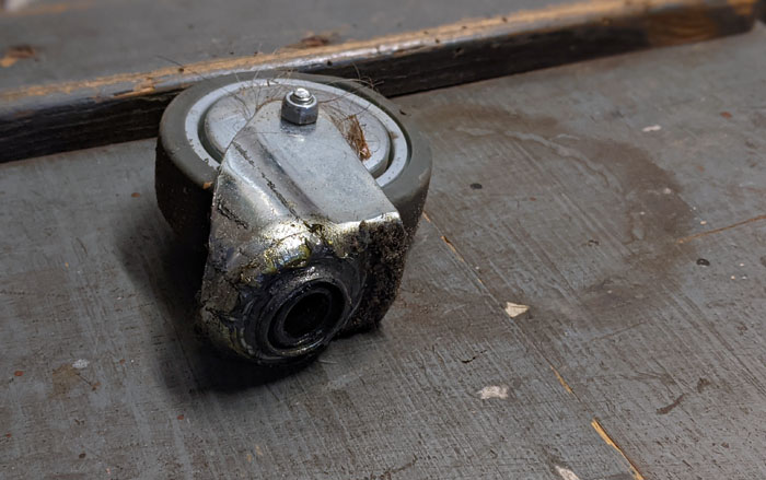Offenbare Schwachstelle bei allen defekten Rädern bislang: Das Drehgelenk. Das Rad bricht einfach von der Halterung ab. Ines hat gestern vier neue Rollen besorgt, die sehr viel stabiler als alle bisher verbauten wirken: Zum einen sind sie größer, so dass weniger horizontale Kraft auf die Halterungen wirkt, wenn man mit der Kiste über irgendwelche Hindernisse fährt (Wir haben ja auch so extrem unwegsames Gelände hier im Laden …), zum anderen sind Ober- und Unterteil sehr viel stabiler miteinander verbunden. In der Mitte ist ein dicker Bolzen, der die Teile zusammenhält.