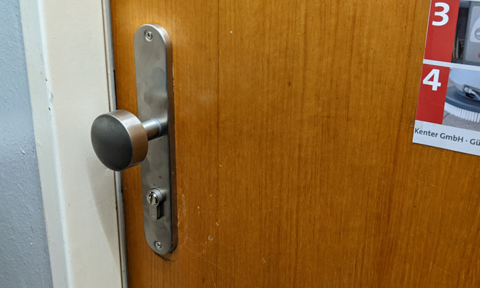 Wir haben schon immer hier drei Toiletten gehabt. Eine davon hat(te) einen "Privat"-Status und war immer abgeschlossen. Ausgestattet war auch diese Tür mit einem gewöhnlichen WC-Türschloss mit Drehverschluss (innen) und Notentriegelung (außen). Diese Notentriegelung bestand aus einem Vierkantstift, für den man nicht einmal ein wie auch immer geartetes Werkzeug brauchte – man konnte die Tür mit spitzen Fingern öffnen.