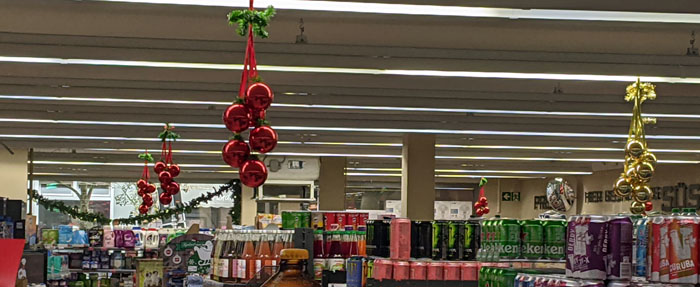 Lichterketten um die Schaufenster, die roten und goldenen Weihnachtskugeln im Markt verteilt, das muss auch in diesem Jahr wieder an Weihnachtsdeko reichen.