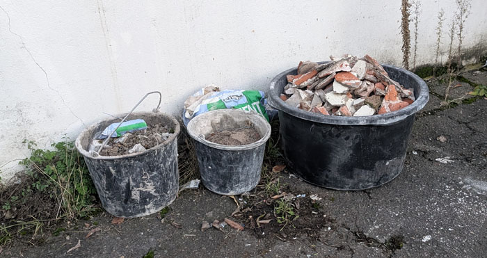 Überraschung am Morgen: Auf dem Hof stehen ein paar Eimer und ein Mörtelkübel voller Bauschutt. Nach Aussage einer Kollegin wurden am Nachmittag an einem unmittelbar hinter der Mauer gelegenen Gebäude Maurerarbeiten ausgeführt und der Handwerker konnte nur über unseren Hof an das Bauteil herankommen. So weit ist das ja auch kein Problem.